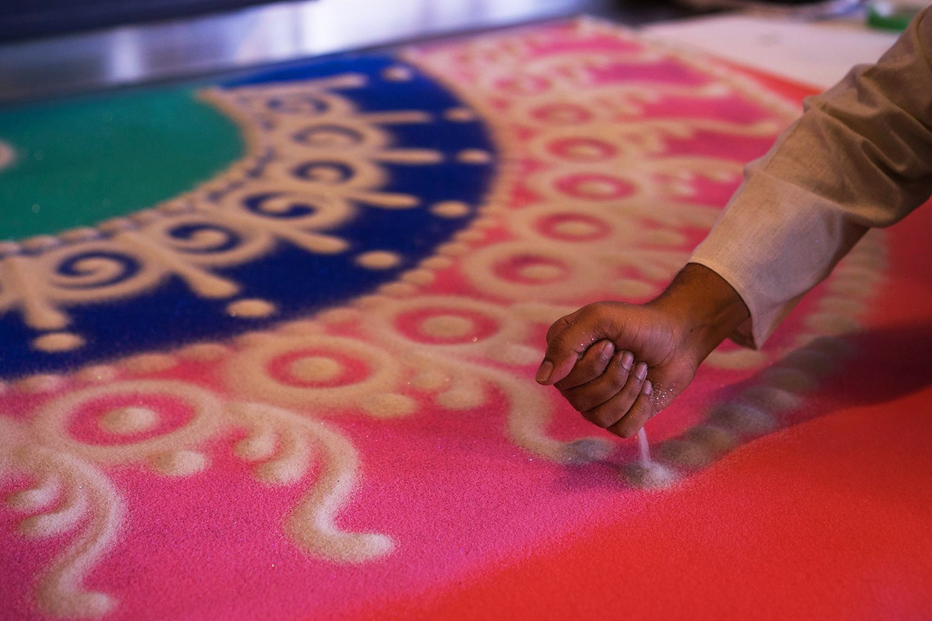 Deep, meaning lamp, served as both title and guiding metaphor. The installation transformed a six by twelve foot surface into a field of colored sand, where each line and shape reflected care, rhythm, and intention. By occupying the floor, the work challenged conventional expectations of gallery and institutional space, asking viewers to consider how cultural practices move between private and public, ritual and contemporary.