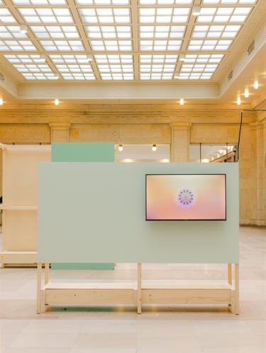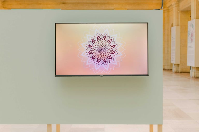 Mandalas of Mindfulness is a digital animation installation created for the DesignTO exhibition Dwell, presented inside Union Station, the busiest transit hub in Canada. The work transforms a high-traffic environment into a brief moment of calm, offering travellers a visual pause amid the pace of daily movement.