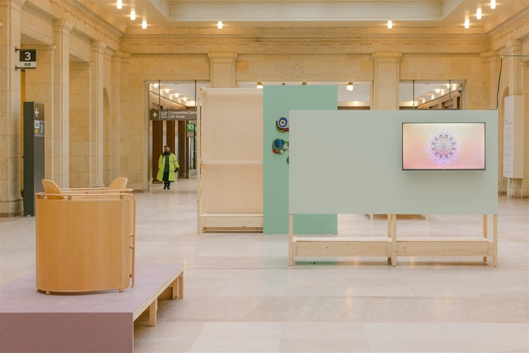 Mindfulness Mandala was exhibited as part of Dwell at DesignTO, an installation inviting moments of calm inside Union Station, Canada’s busiest transit hub. With hundreds of thousands of travellers moving through each day, the work creates a brief pause in the rush, offering a quiet space to breathe and reconnect.
