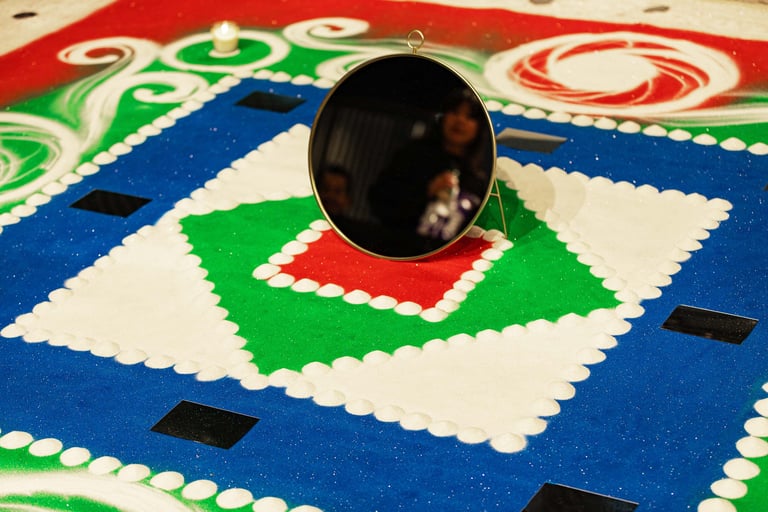 પડછાયો (The Shadow Within) is a contemporary Rangoli installation, one of the first large-scale exhibitions of this traditional art form in North America. The work combines colored sand, mirrors, and lamps to create an immersive environment exploring mental health, resilience, and self-reflection within an urban context.